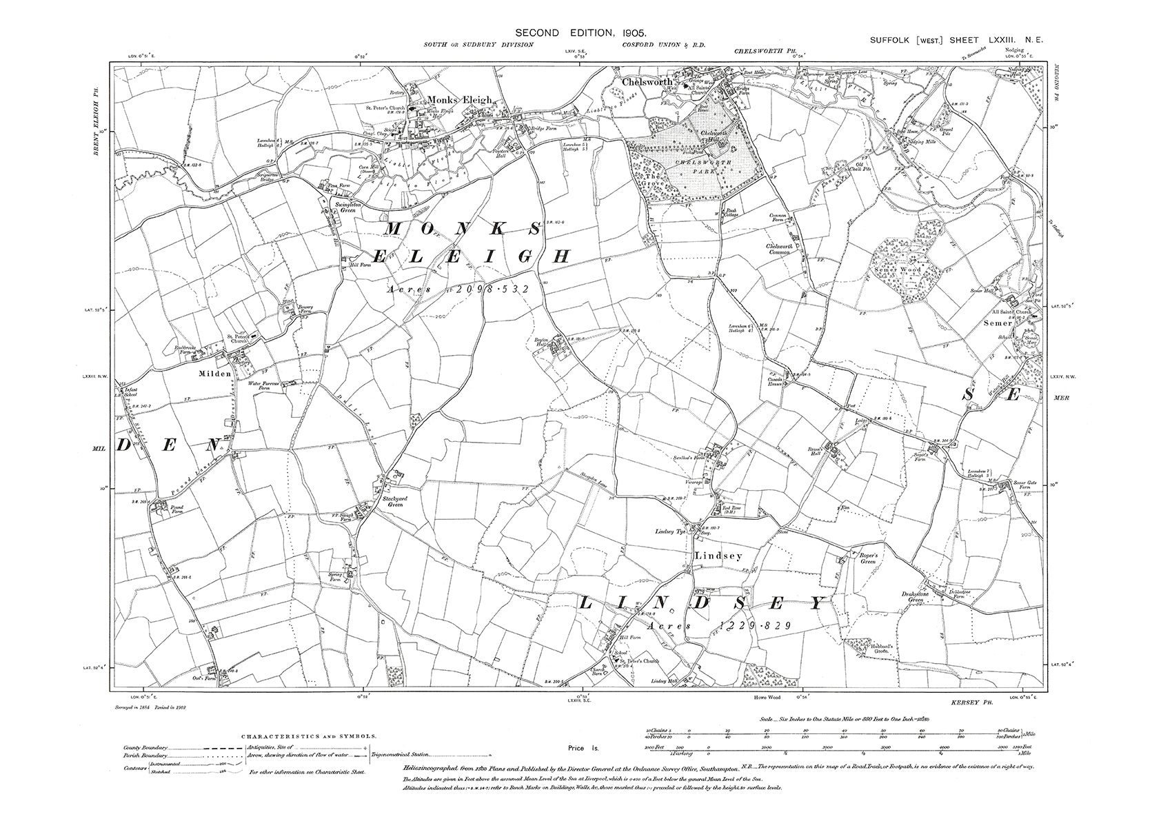 Monks Eleigh, Chelsworth, Lindsey, Milden, old map Suffolk 1905: 73NE