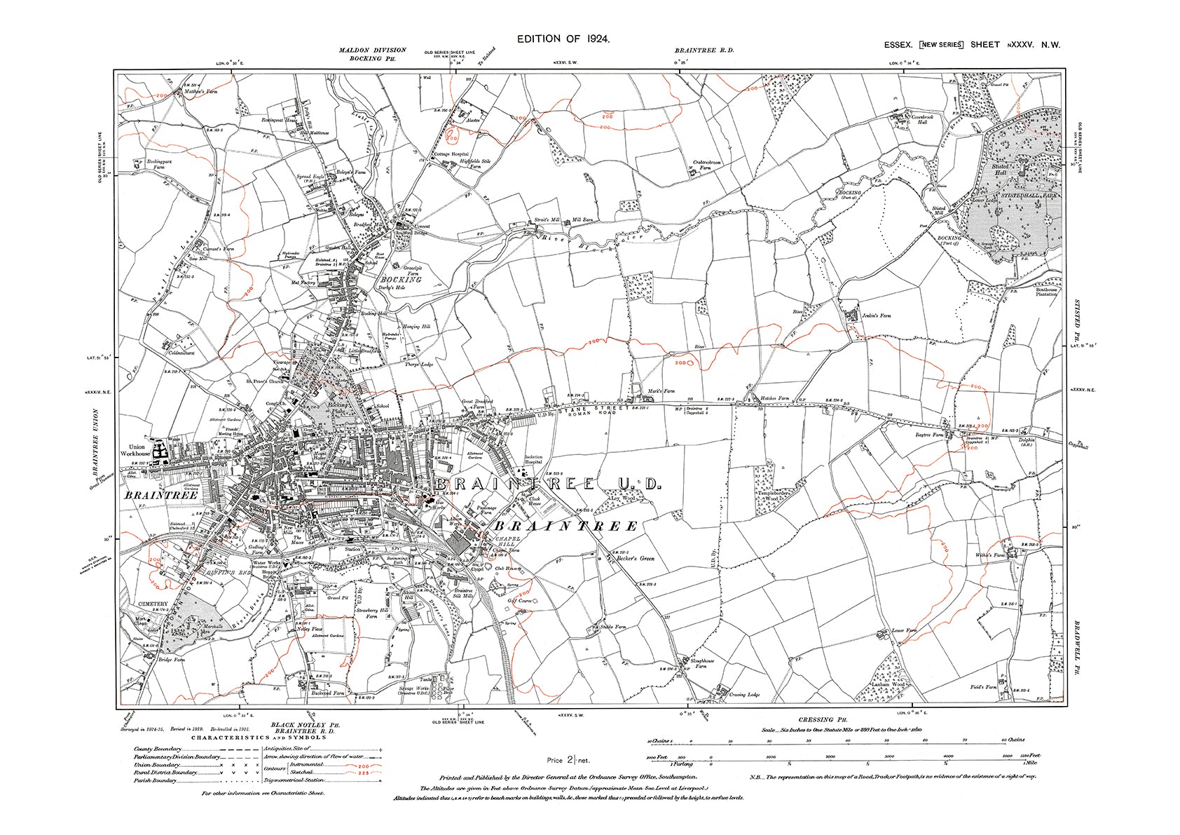 Old OS map dated 1923, showing Braintree and Bocking in Essex - 35NW
