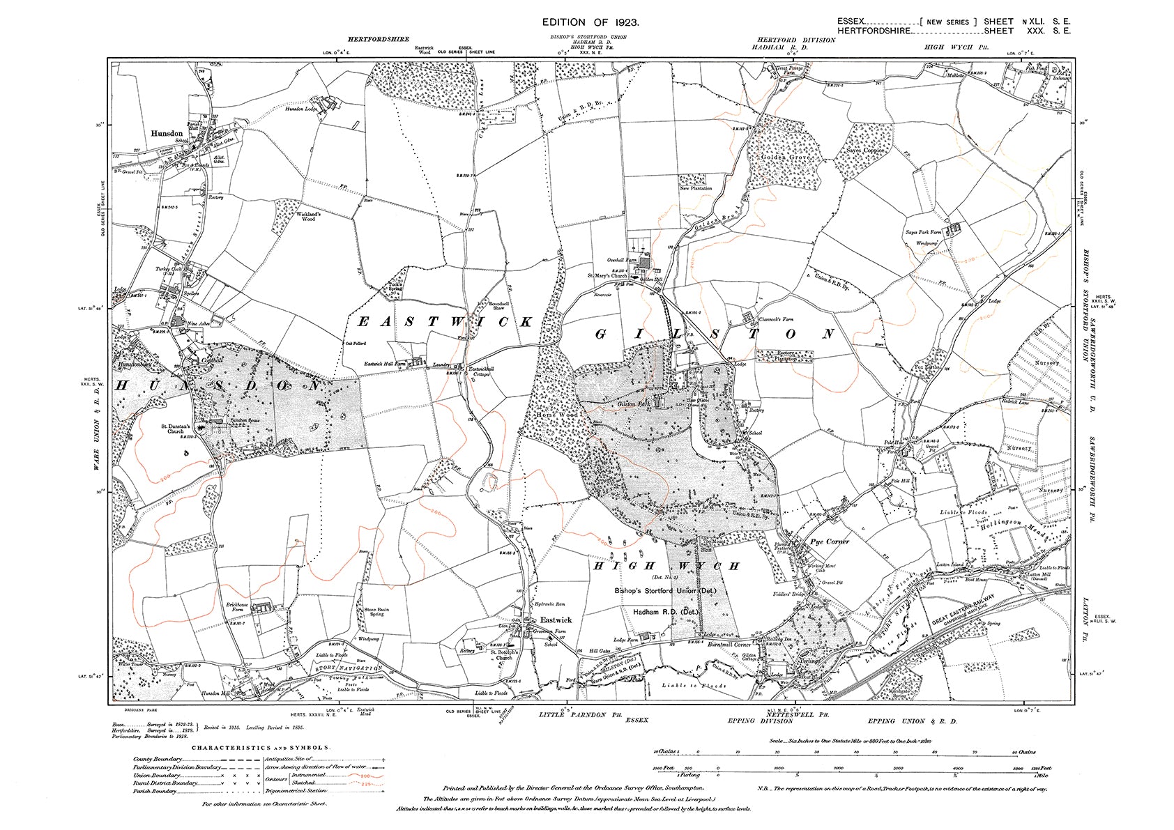 Old OS map dated 1923, showing Hunsdon, Eastwick, PyeCorner and Gilston in Essex - 41SE