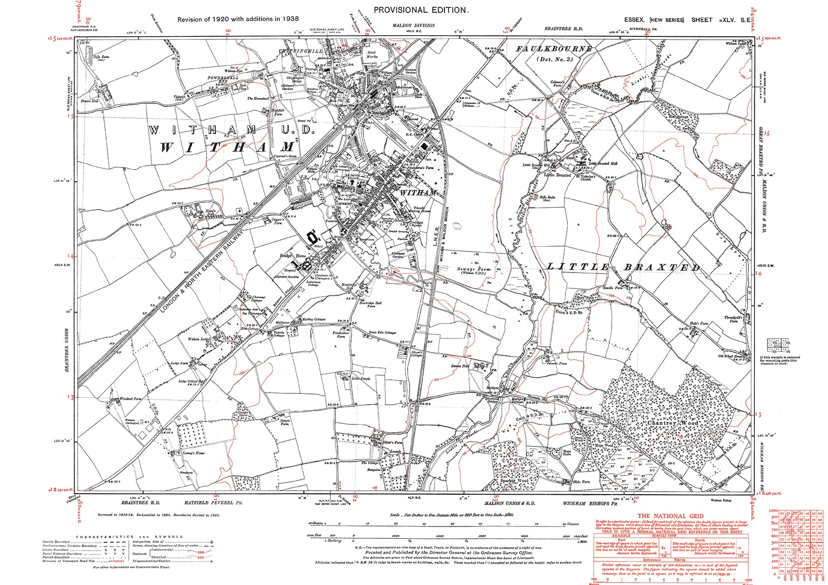 Old OS map dated 1938, showing Witham and Little Braxted in Essex - 45SE